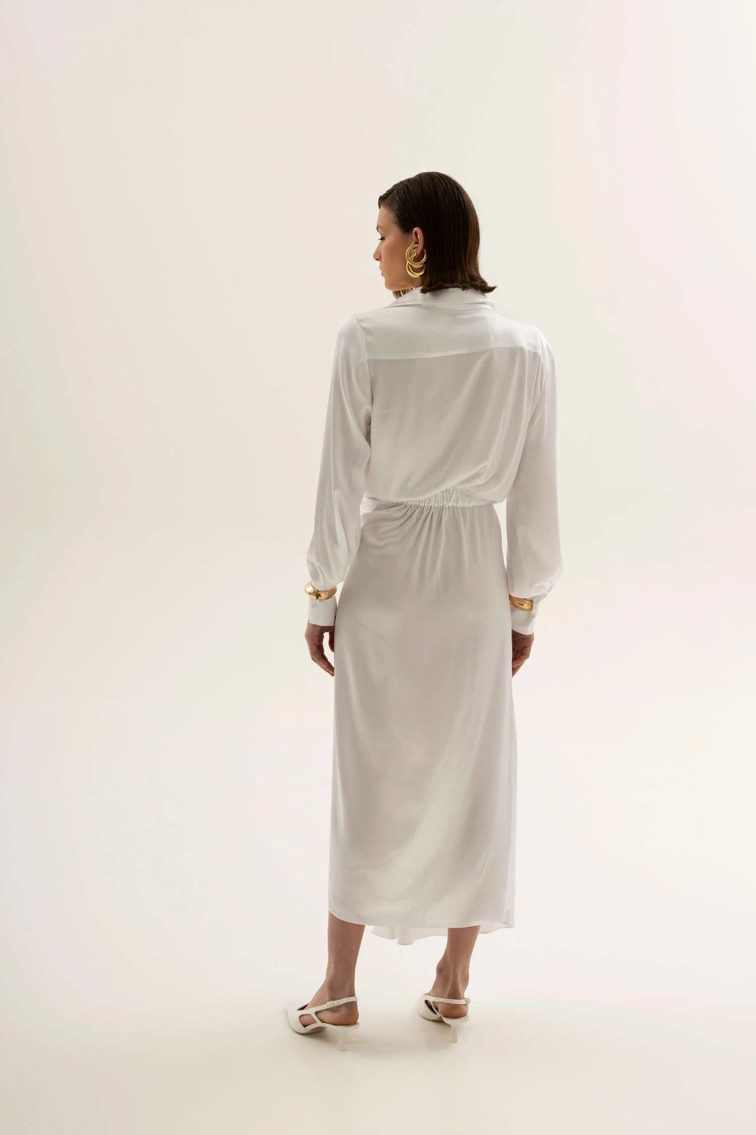 A whisper of clarity — Endless Kiss is a shirt-dress that turns simplicity into sculpture. Cut from fluid white fabric, it gathers in a twisted knot at the waist, letting soft draping fall with effortless ease. The sharp collar and long sleeves lend structure, while the plunging neckline opens into quiet seduction. Minimal yet magnetic, it’s a piece that shifts seamlessly from day into night, from understated to unforgettable.