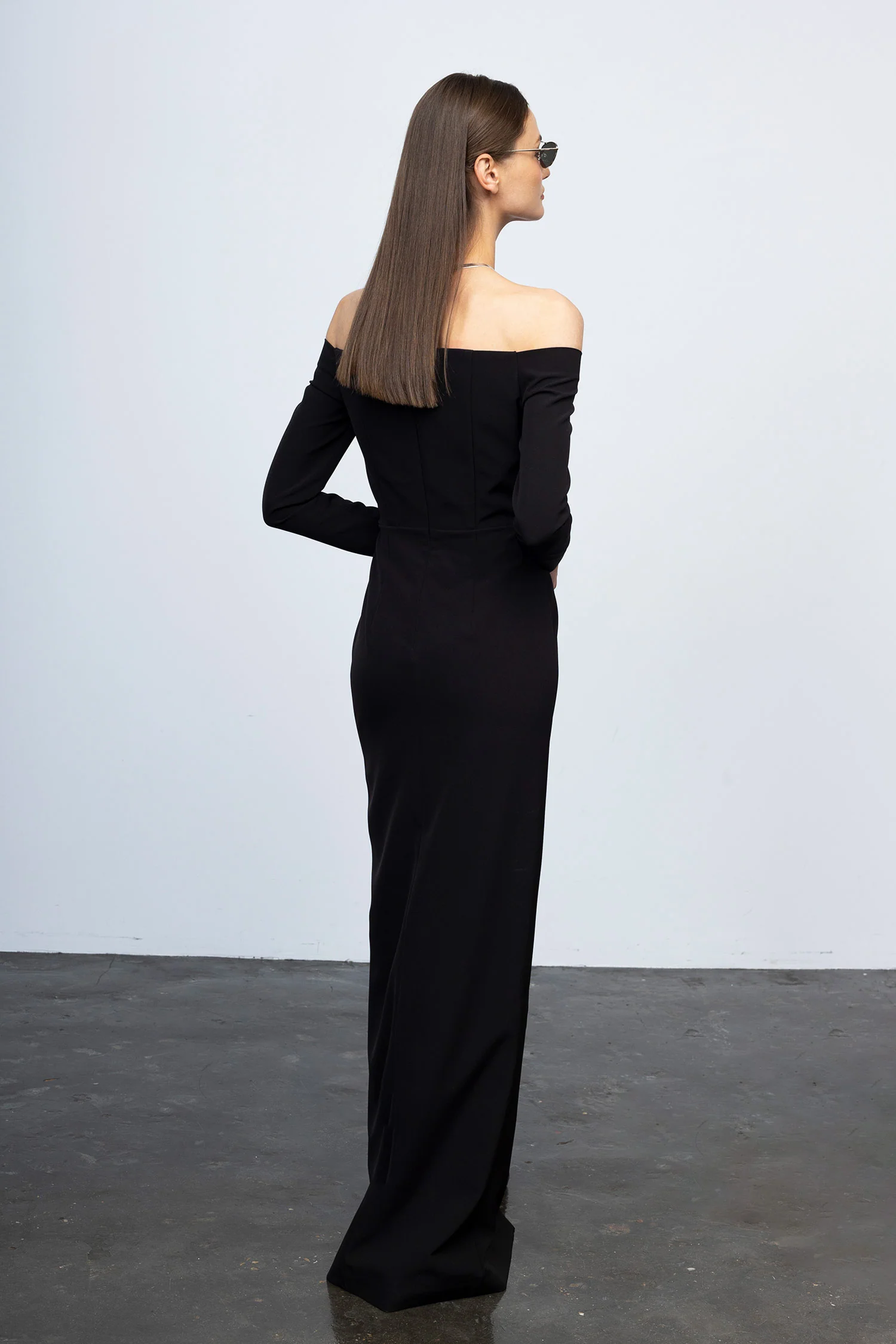A silhouette of sharp allure β Gata Salvaje is a gown that balances timeless refinement with modern boldness. The off-the-shoulder neckline carves a clean frame across the collarbones, while long sleeves extend its elegance in measured restraint. Sculpted to the body with architectural precision, it opens into a daring thigh-high slit, a flash of confidence that transforms minimalism into statement.