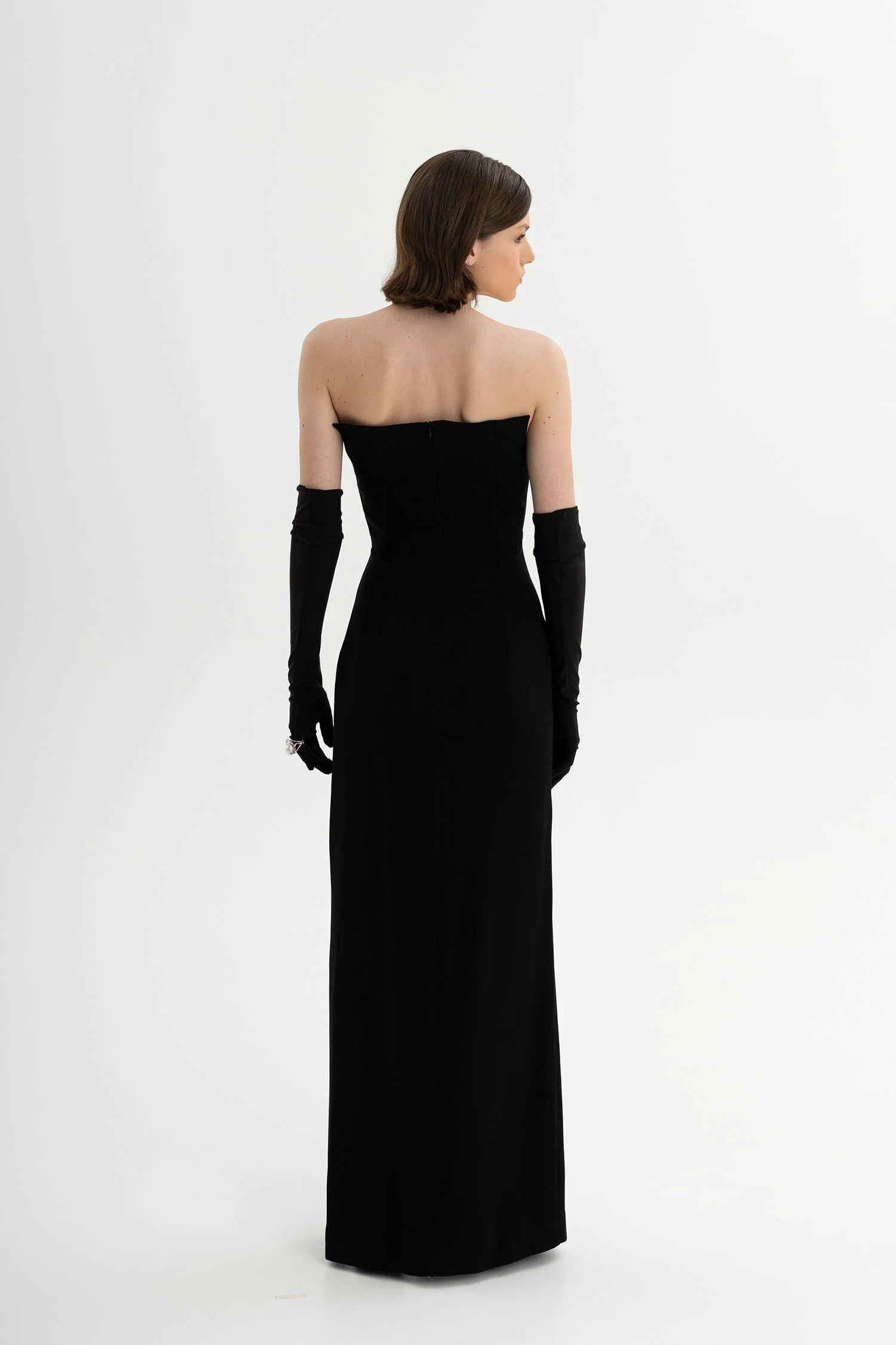 A constellation stitched in midnight —La Furia Negra is a gown that fuses classic glamour with modern seduction. Cut in a sculpted strapless silhouette, it traces the form with quiet precision, while crystal buttons glimmer like stars across the front. A daring slit reveals lace beneath, a secret detail made to intrigue. Finished with opera-length gloves, it becomes a portrait of elegance both timeless and arresting.