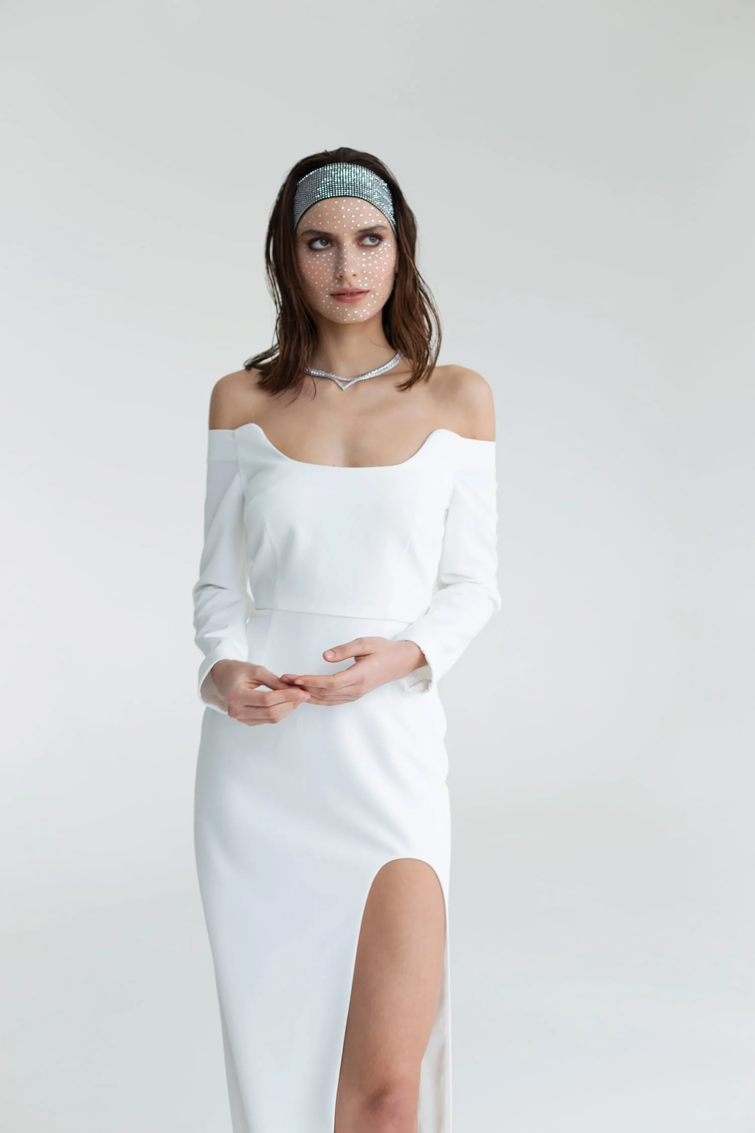 With architectural poise and quiet power, L'amour Ardent embodies modern divinity. Its structured shoulders and square neckline frame the silhouette with precision, while the daring thigh-high slit cuts through the purity of white with a whisper of rebellion. Minimalist yet commanding, it balances elegance with a touch of danger.