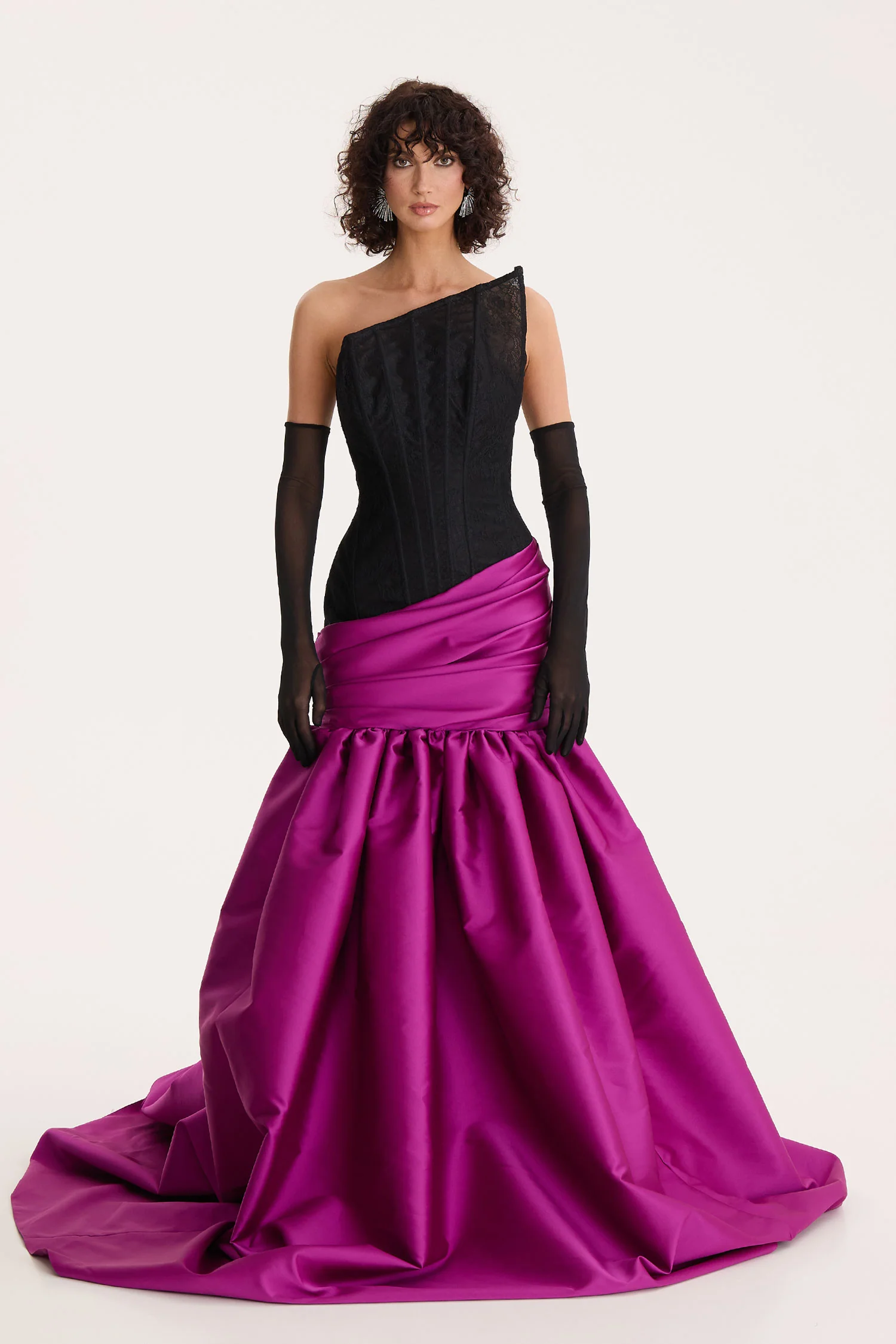 A cinematic homage to timeless glamour, Midnight Orchid is sculpted with a structured black lace bodice that contours the silhouette with quiet confidence. The asymmetric neckline adds a modern edge, while the vibrant fuchsia skirt unfurls in luminous folds, crafted from rich taffeta that catches the light with every movement. Ruched draping at the hip melts into a voluminous, gathered hemline—striking, feminine, and undeniably dramatic.