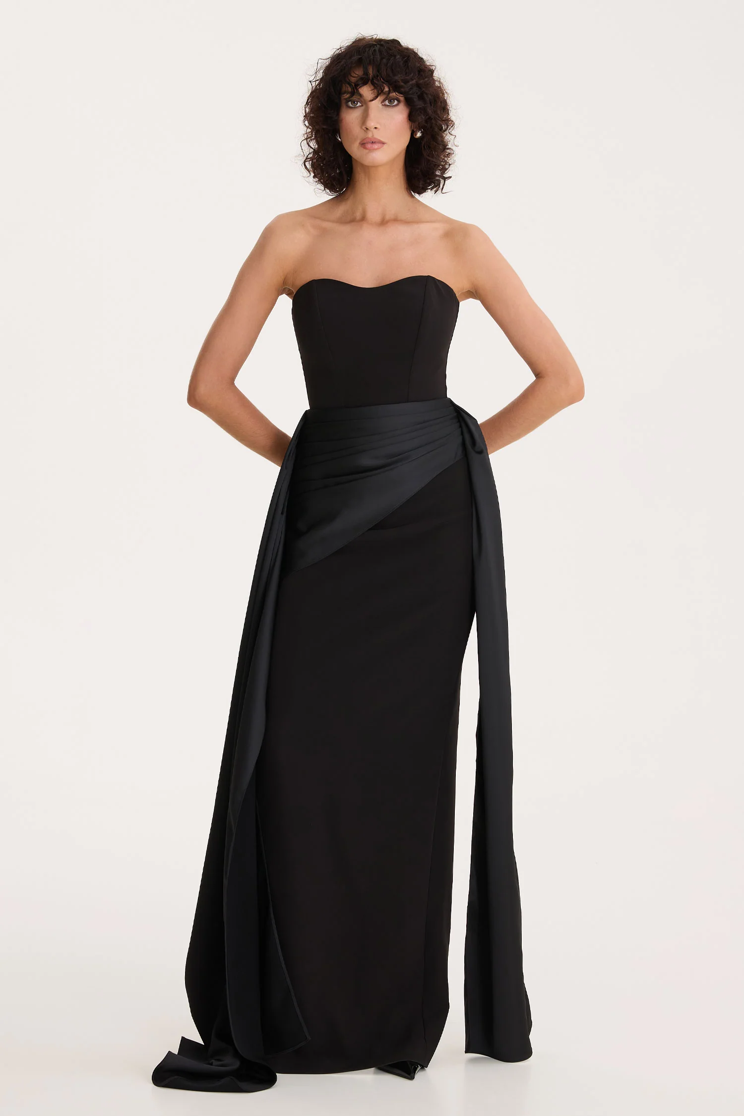 Wear the gown in full for maximum impact, or detach the drapes and shoulder piece to shift the look from dramatic to minimal in seconds. One dress, three identities.