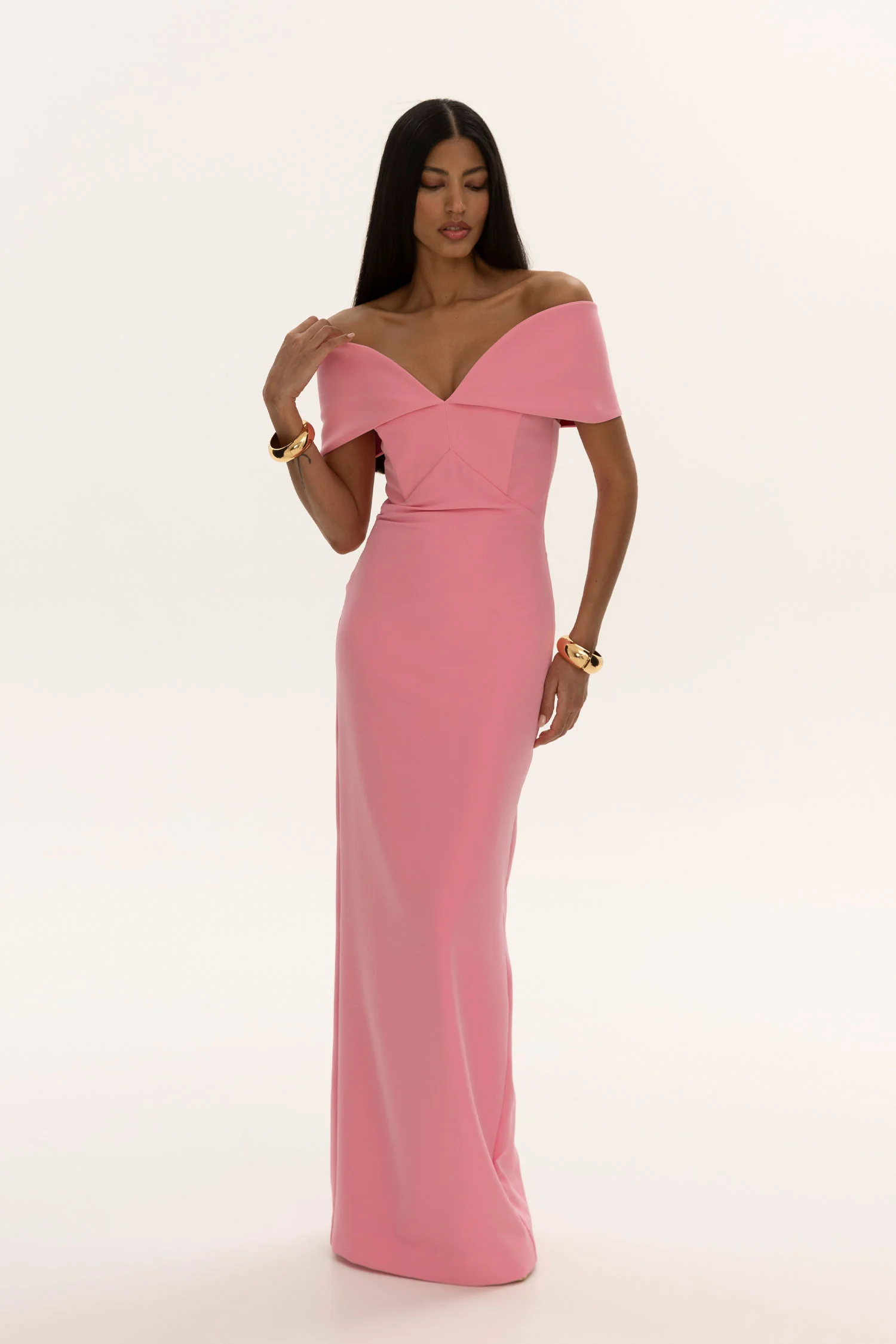 A silhouette that speaks in soft declarations — Pink Muse is a floor-length gown in radiant pink crepe, sculpted with architectural precision. The off-shoulder neckline folds into a deep V, framing the collarbones with quiet drama, while the clean lines elongate the figure in uninterrupted grace. Feminine yet commanding, this is the dress that doesn’t merely adorn — it declares devotion.