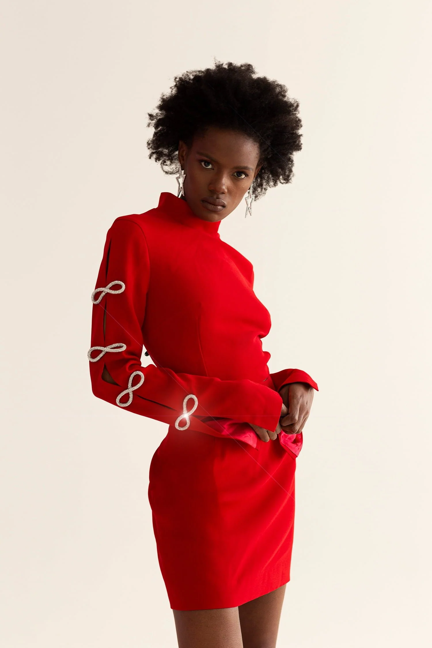 This red mini dress crafted from tricacetato gracefully hugs the body’s natural curves. The dazzling details on the sleeves create the perfect balance between classy and fun. Wear it with some slingback heels and be sure to steal the spotlight.