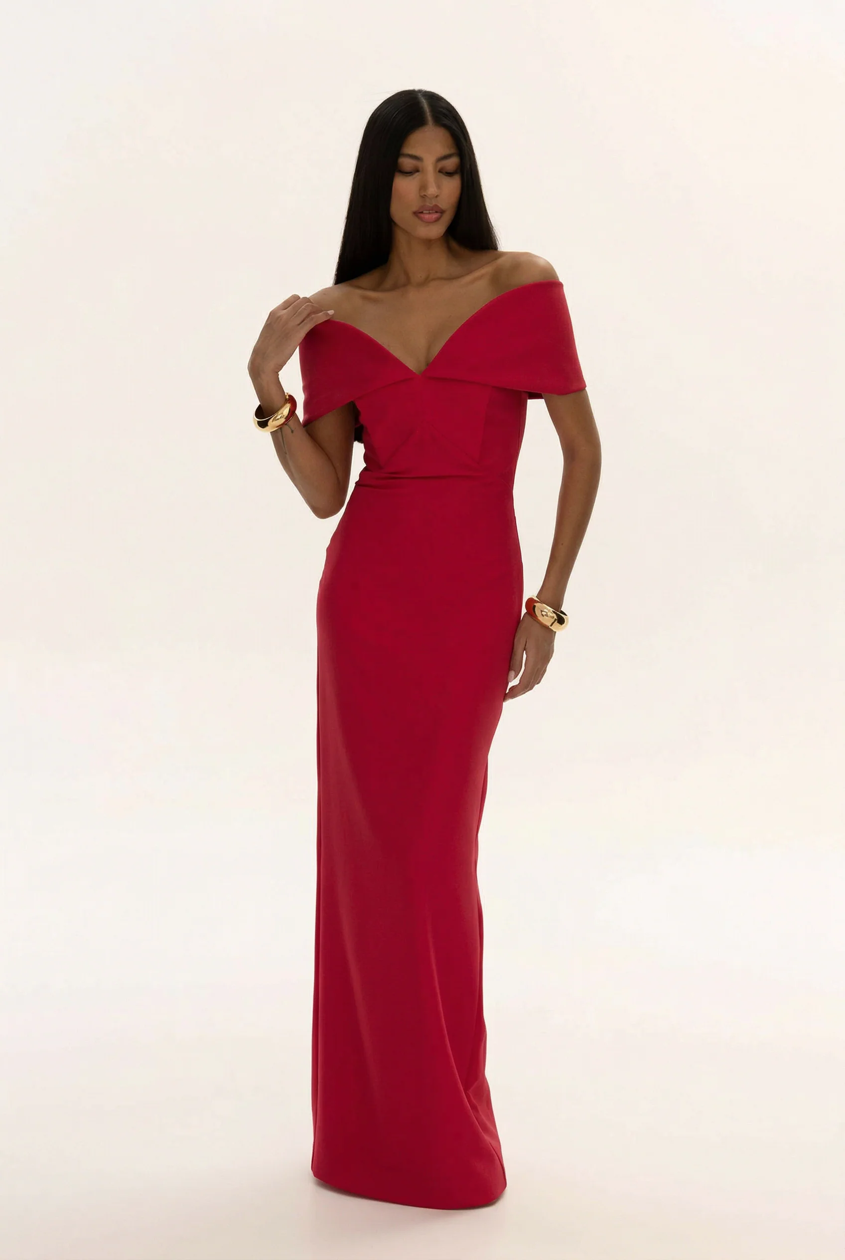 A silhouette that speaks in bold sonnets of fire — Red Muse is a floor-length gown sculpted in saturated scarlet. The off-shoulder neckline frames the collarbones like architecture, folding into a deep V that commands without asking. Clean lines elongate the figure, while the structured bodice holds its form with quiet strength. This is the dress that doesn’t just enter a room — it owns it.