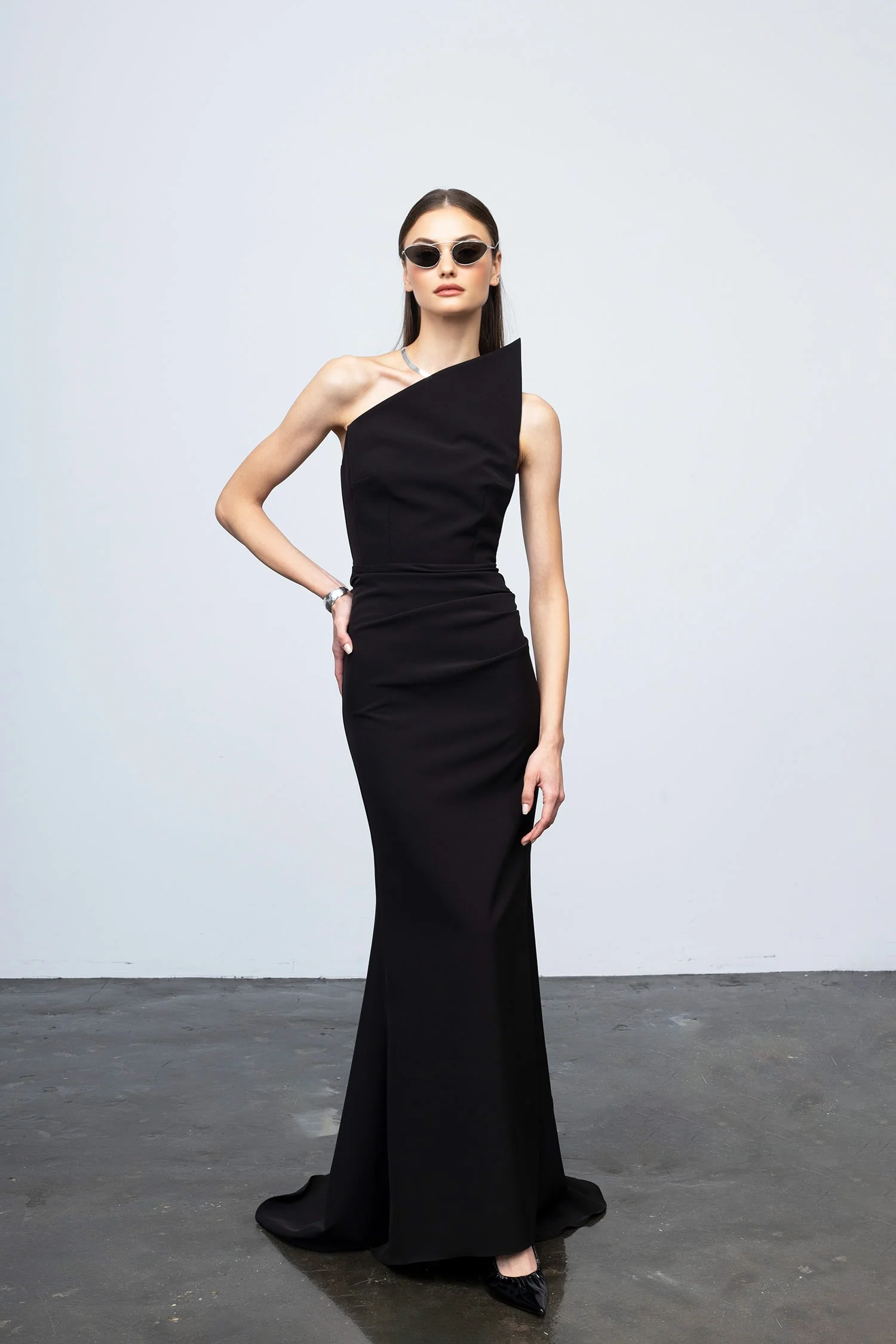 Step into sleek sophistication with the Triangle of Love — a masterclass in sharp tailoring and modern allure. Defined by its sculptural one-shoulder neckline and flawless draping, this silhouette carves out elegance with a quiet kind of power. The deep black hue exudes timeless drama, while the elongated form hugs and flows in all the right places.
