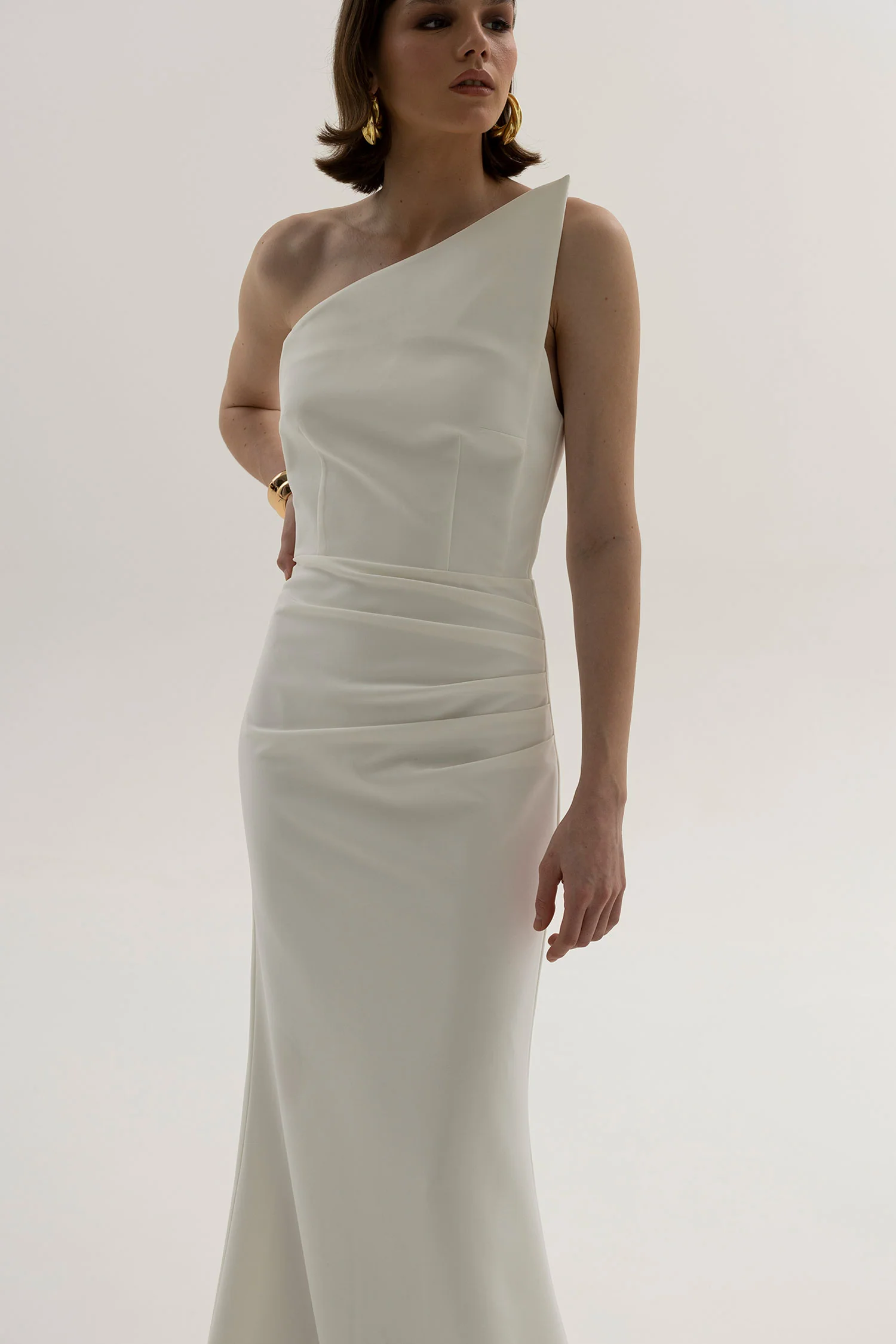 A study in balance and boldness — White Triangle is a sculptural one-shoulder gown that speaks in clean lines and silent confidence. Crafted from structured crepe with a satin touch, it features an asymmetrical neckline that slices diagonally across the collarbone, framing the shoulders with architectural precision. The bodice is gently contoured, leading into a high-waisted silhouette with soft, artful pleating that elongates the form and adds quiet dimension.
